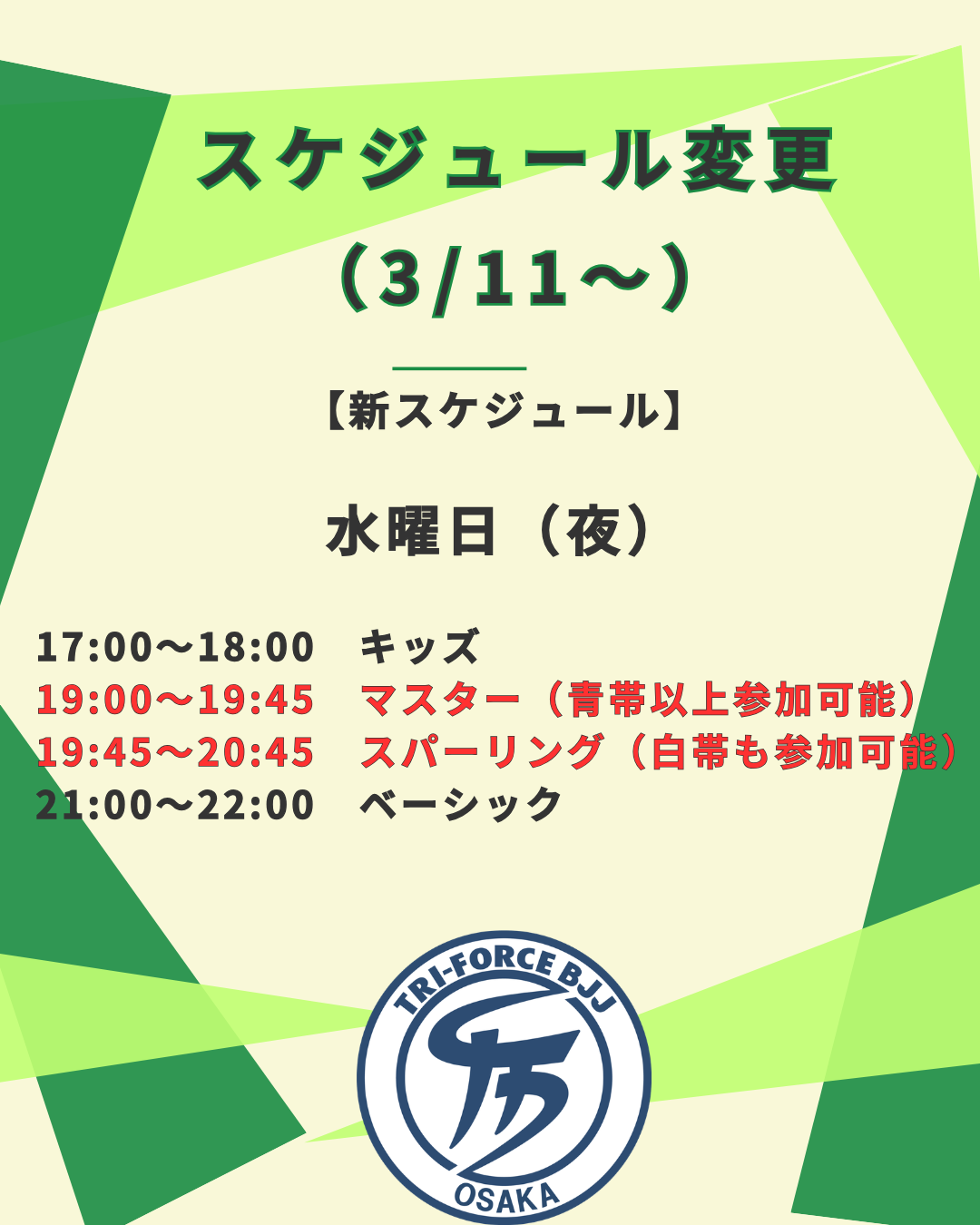 3/11 (水) より水曜日夜のスケジュールを下記の通り変更いたします。