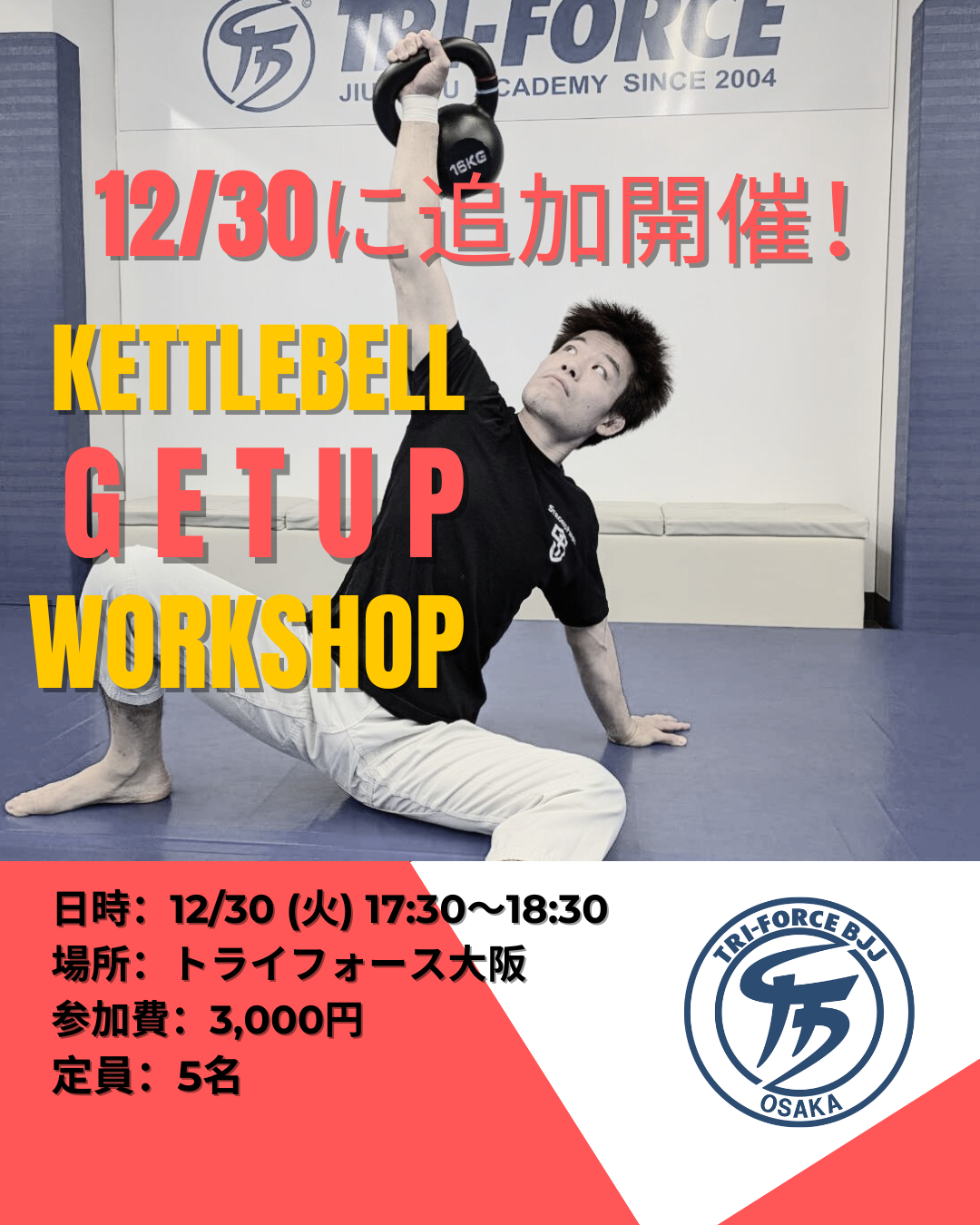 申込み方法:osaka@triforce-bjj.comまでEメールで、件名は「12/30ケトルベルワークショップ申込み」、本文にはお名前と所属をお知らせ下さい。一般の方は「一般」とお書きください。