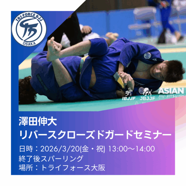 3/20 (祝・木)に 澤田伸大先生の「リバースクローズドガード」 セミナーをトライフォース大阪にて開催します。